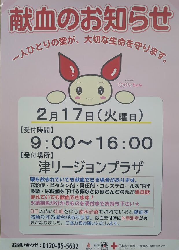 このたび、2026年2月17日(火)に津リージョンプラザで献血が実施されます。受付時間は9:00~16:00です。午前の用事を済ませてから、あるいはお仕事の合間など、都合のつく時間帯で参加しやすいスケジュールになっています。ご都合の合う方は、ぜひ足を運んでいただければ幸いです。
